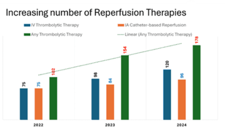 It is critical that the public becomes familiar with the signs and symptoms of stroke, and that someone calls 9-1-1 immediately. University Hospital has extensive experience in treating stroke patients with removing clots safely. The number of catheter-based endovascular reperfusion procedures has increased over the past few years. In 2022 we treated 75 patients and in 2023 it was 84 patients. In 2024 we treated 96 patients.